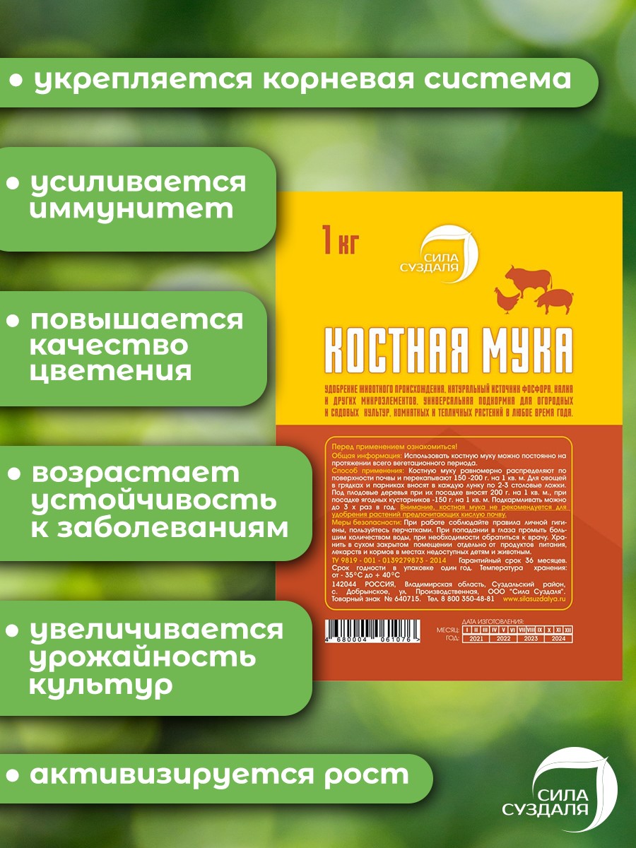 Костная мука от Сила Суздаля подходит практически всем огородным культурам, цветам и деревьям. Особенно хорошо переносится цветущими растениями, позволяя вырастить крупные, обильные бутоны цветов. Но не следует использовать удобрение в отношении растительности, предпочитающей кислую почву (рододендроны, камелии, хвойные растения).